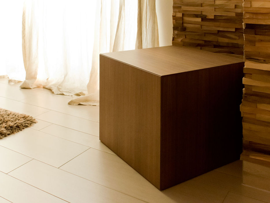 Prägendes Element des Entwurfs sind die Mosaikholz-Wandverkleidungen. Die fein gegliederten Holzflächen verleihen dem Raum eine spürbare Tiefe und natürliche Wärme. Durch das wechselnde Spiel von Struktur und Licht entsteht eine lebendige, zugleich ruhige Oberfläche, die dem Schlafzimmer eine individuelle und handwerklich geprägte Identität gibt.