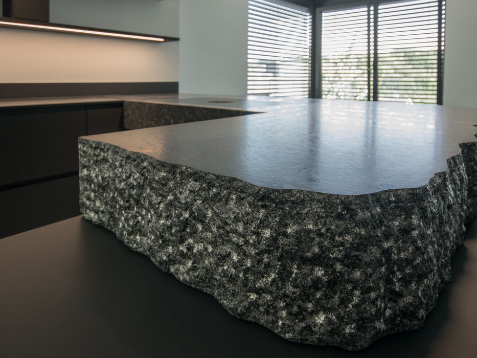 Inmitten der Stadt und doch voller Ruhe: Diese maßgefertigte Einbauküche vereint architektonische Klarheit mit roher Ursprünglichkeit. Zentrum des Raumes ist ein freischwebender Kochblock aus massivem Bruchstein – kraftvoll, ungeschliffen und zugleich präzise inszeniert.
