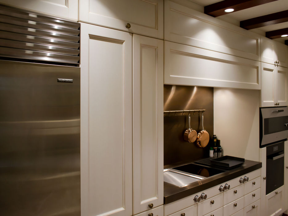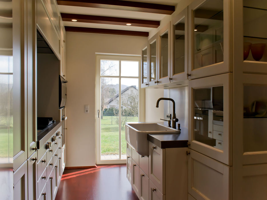 Dabei entsteht ein bewusst inszenierter Spannungsbogen zwischen traditioneller Gemütlichkeit und innovativer Küchentechnik. Modernste Ausstattung wird harmonisch in das Gesamtbild integriert, ohne die ruhige, wohnliche Atmosphäre zu dominieren. So entwickelt sich ein Raum, der gleichermaßen funktional, repräsentativ und emotional erlebbar ist.